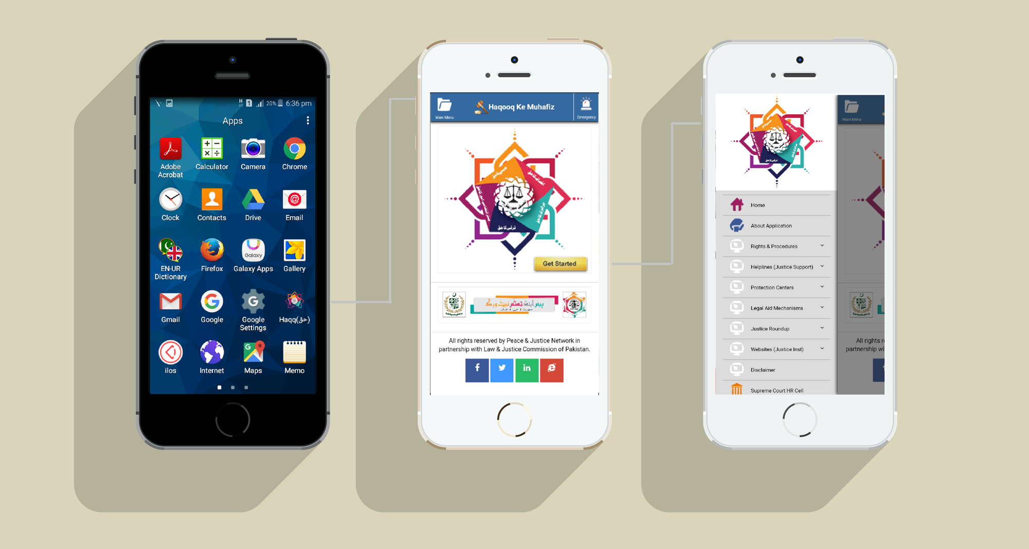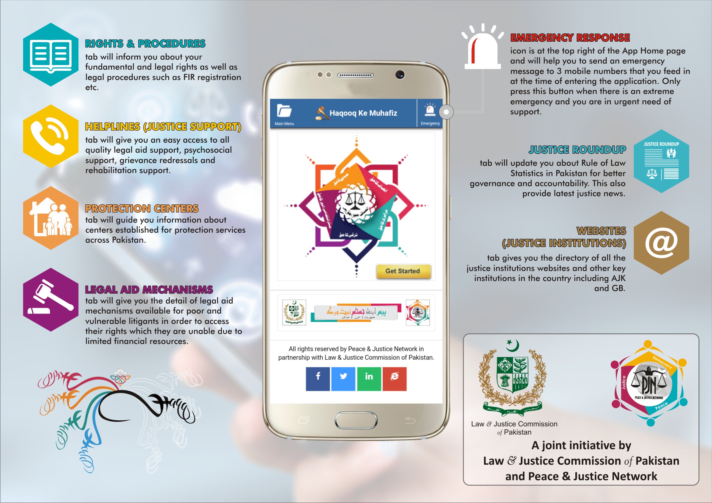 Peace & Justice Network (PJN) in partnership with Law & Justice Commisison of Pakistan (LJCP) launched first ever mobile application on legal empowerment and access to justice on 29th August, 2016 in “National Exhibition on the use of Information Technology in Justice Sector”. Application is available on google play store on following link